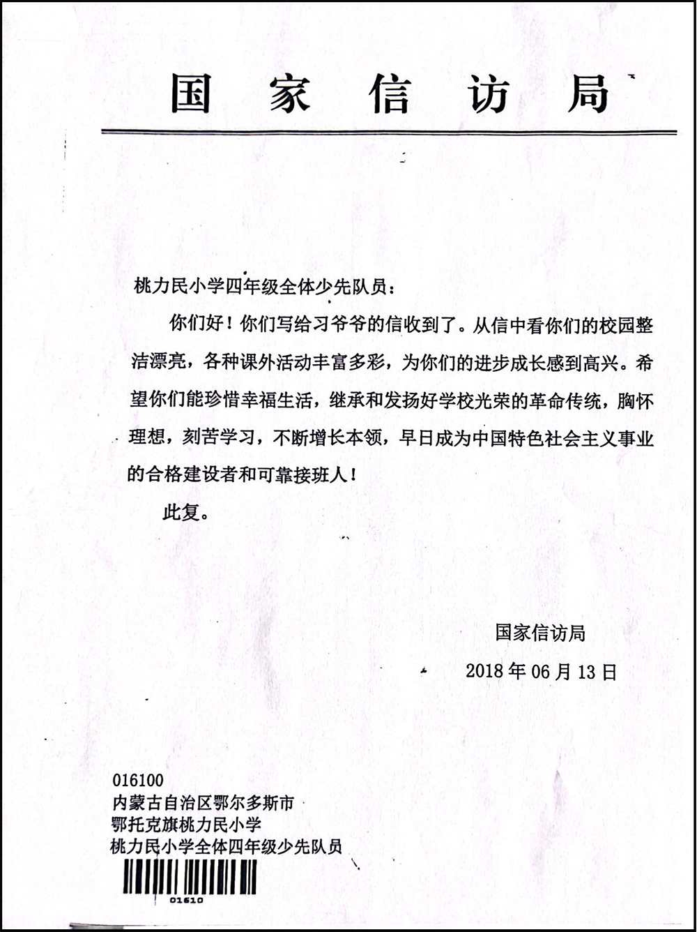 2018年5月18日,桃力民小学少先队员给习近平总书记写信,6月13日,全校师生以万分激动的心情接收了国家信访局的回信。