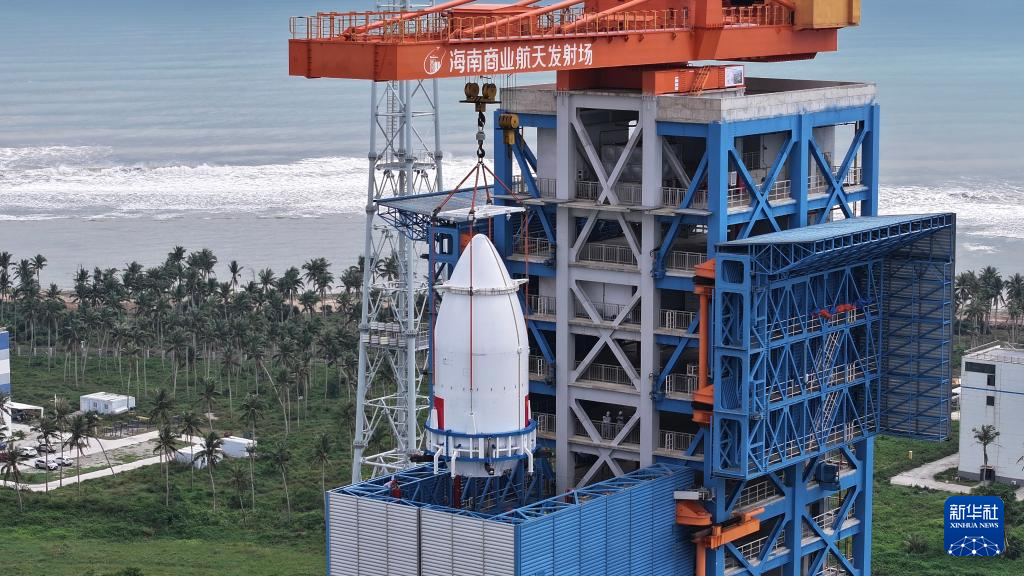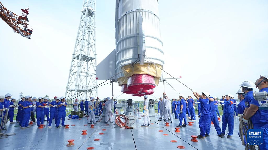 11月11日,发射场工作人员对长八甲遥五火箭进行吊装作业。