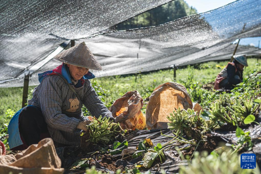 11月17日,农民在云南省保山市隆阳区杨柳白族彝族乡冷水村一处山葵种植基地采摘山葵。新华社记者 高咏薇 摄