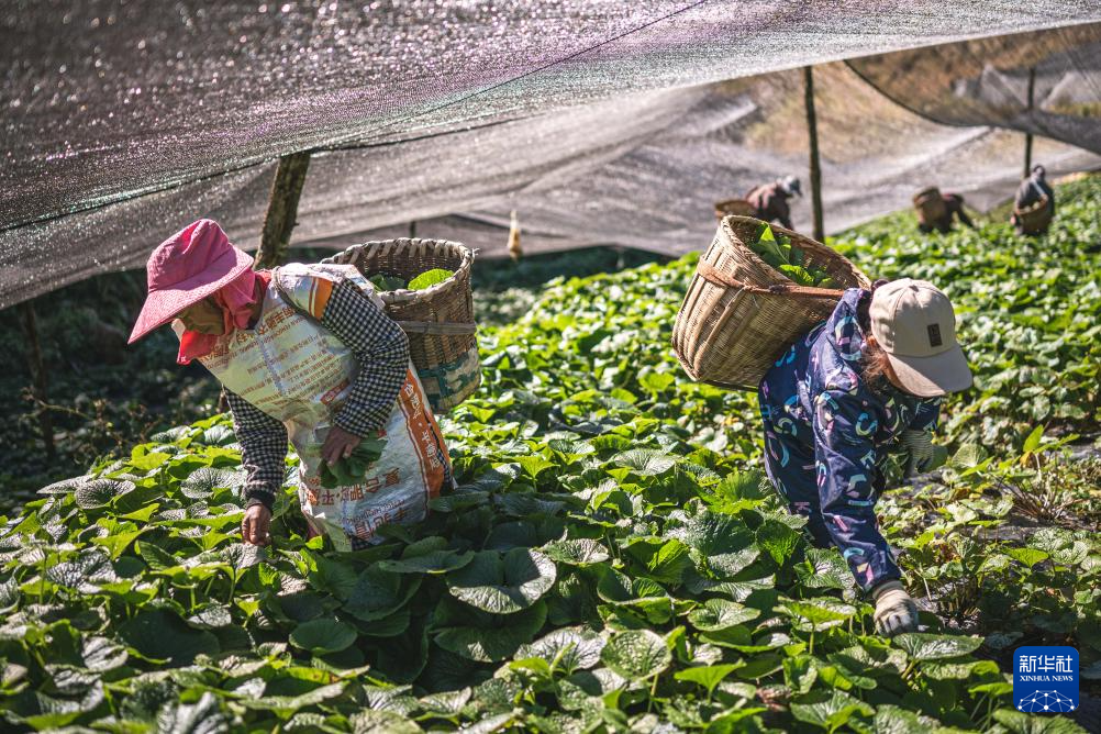 11月17日,农民在云南省保山市隆阳区杨柳白族彝族乡冷水村一处山葵种植基地内采摘山葵。新华社记者 高咏薇 摄