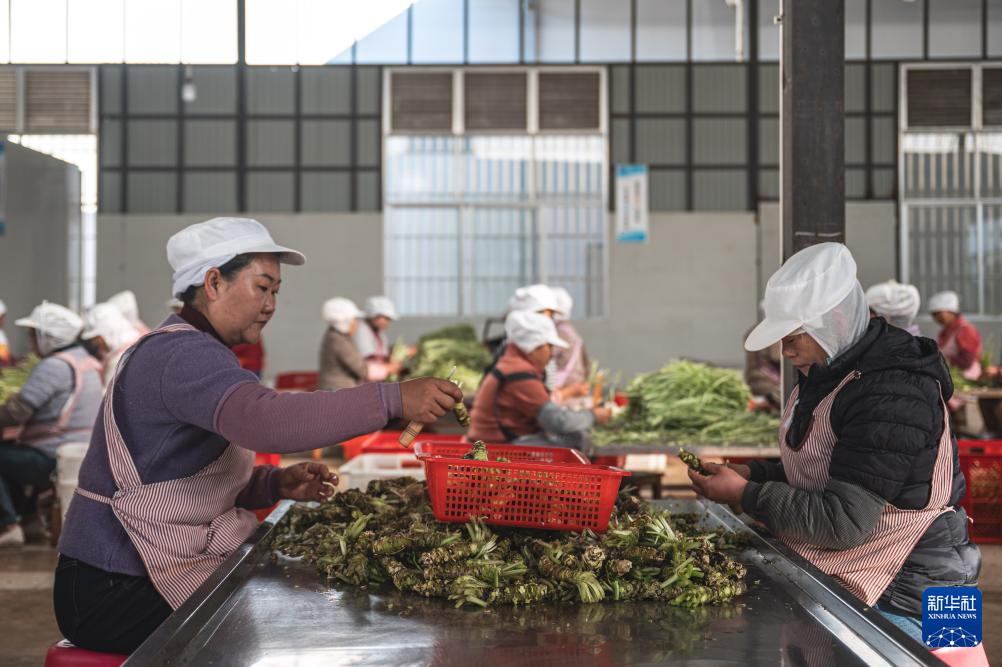 11月18日,工人在云南省保山市隆阳区板桥镇的保山市山葵实业开发有限责任公司加工车间内初加工山葵叶柄。新华社记者 高咏薇 摄