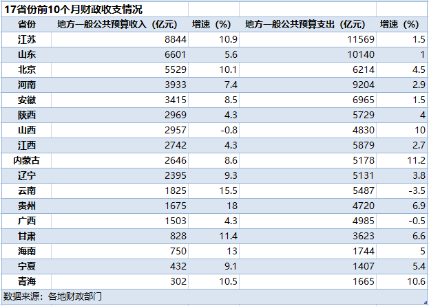 第一财经记者梳理各地财政部门数据发现,截至发稿时间,17个省份公开了前10个月财政收支数据。其中除了山西外,其他省份地方一般公共预算收入均实现增长,这反映地方经济稳步复苏带动收入增长。